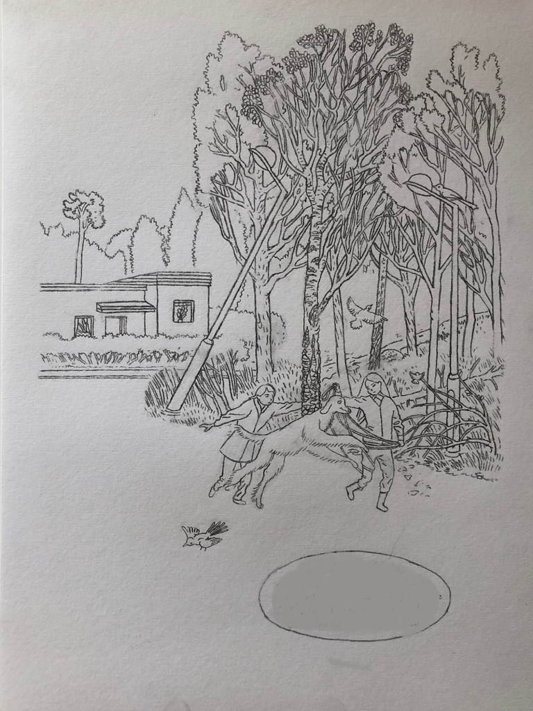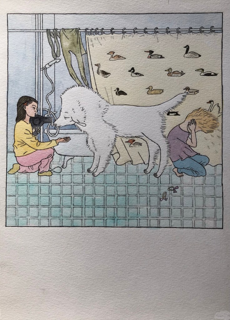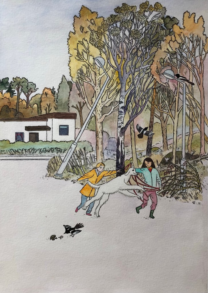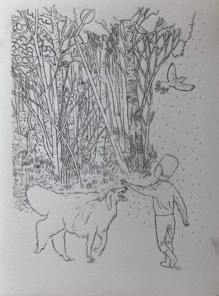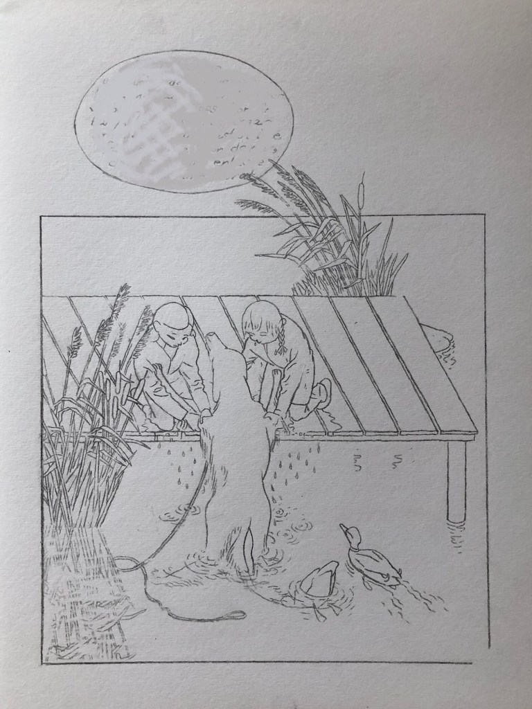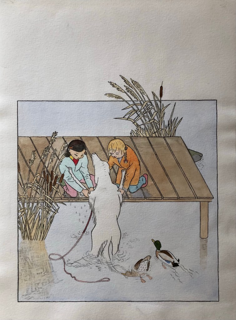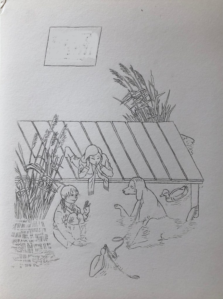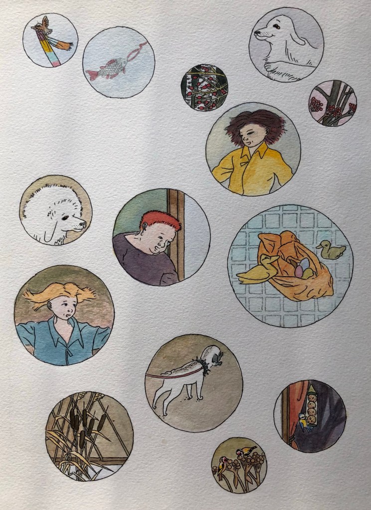 Skickade in ett förslag till en tävling för illustrationer till en barnbok 2009, till en text av Eva Lindström. De blev inte antagna, men jag gillar dem. Har suddat all text.