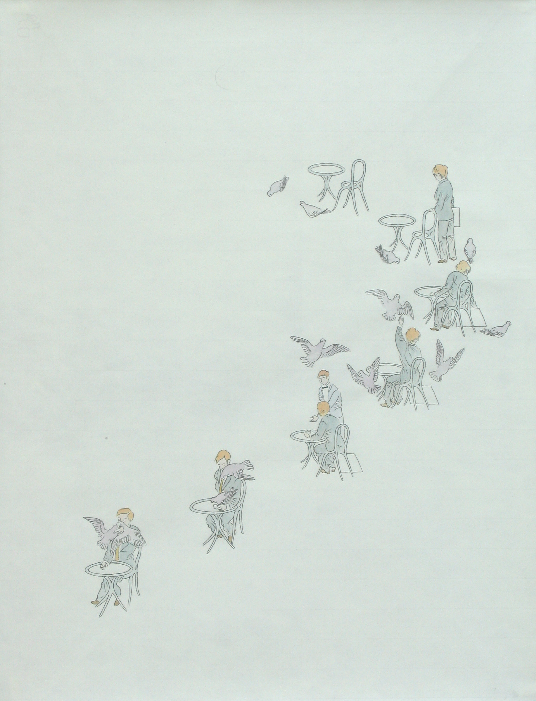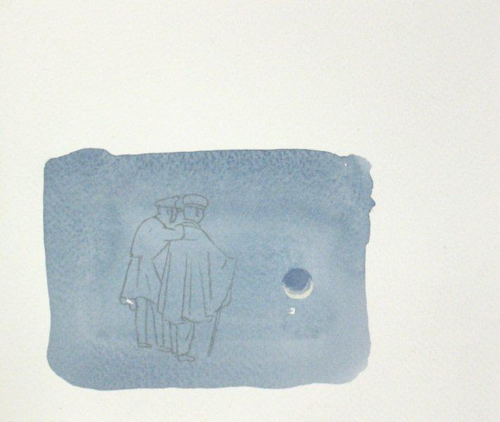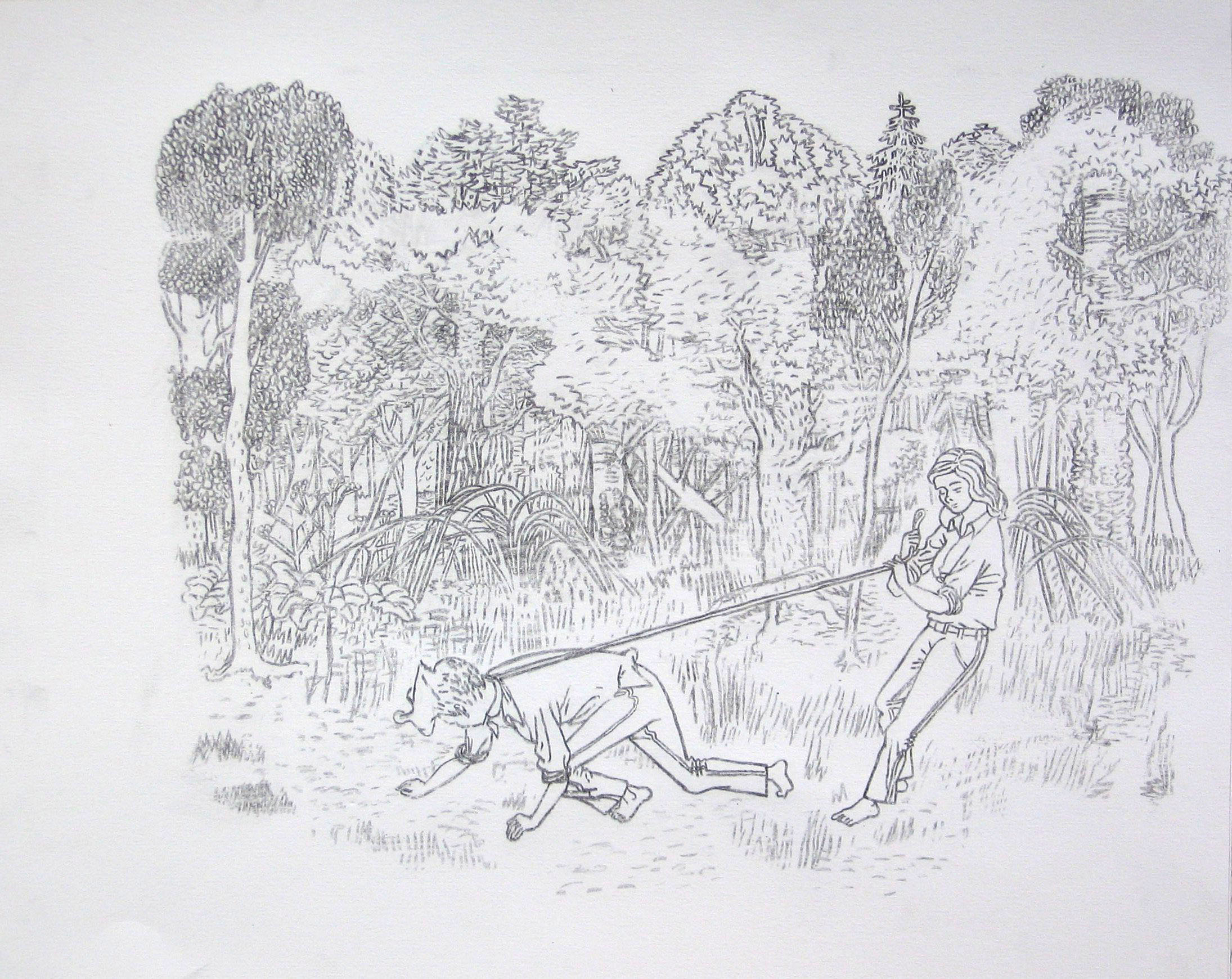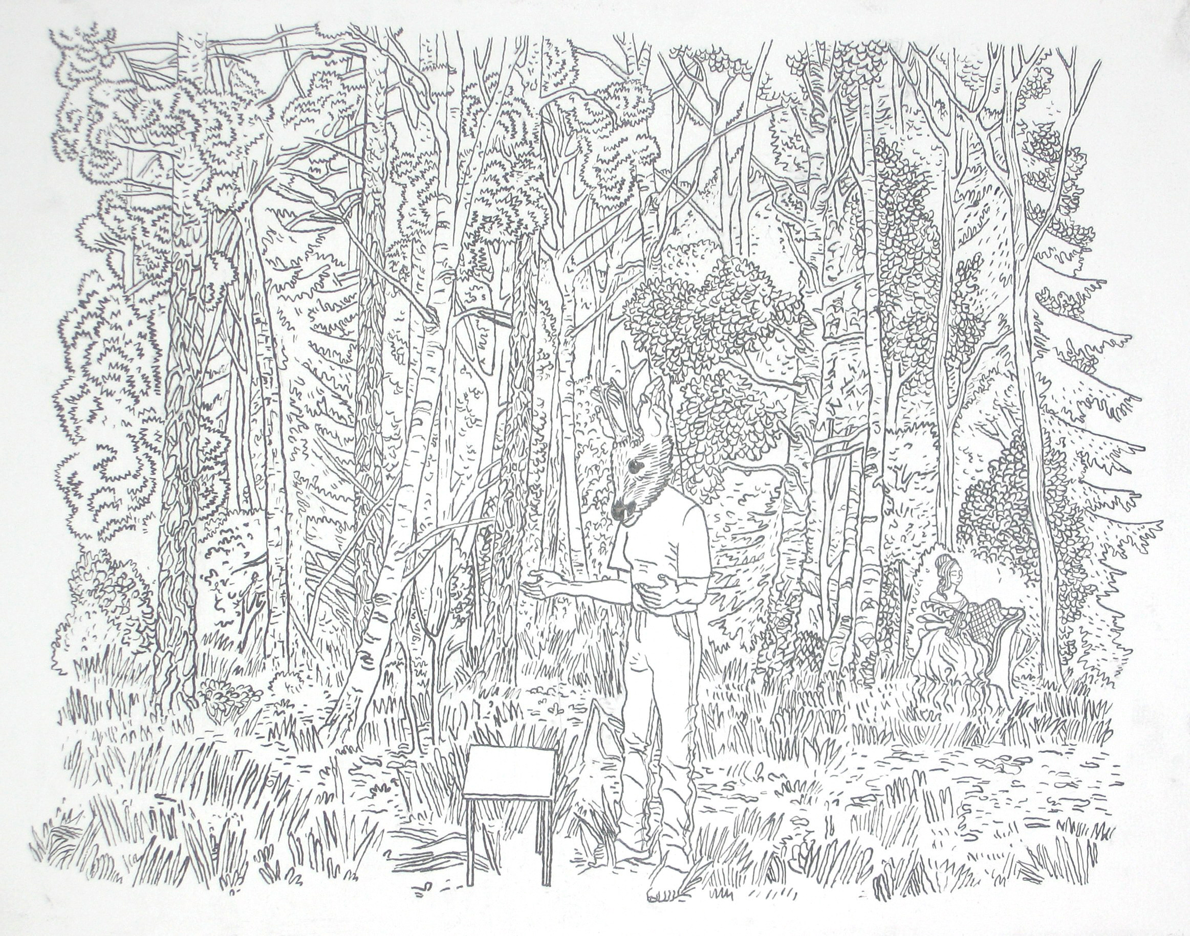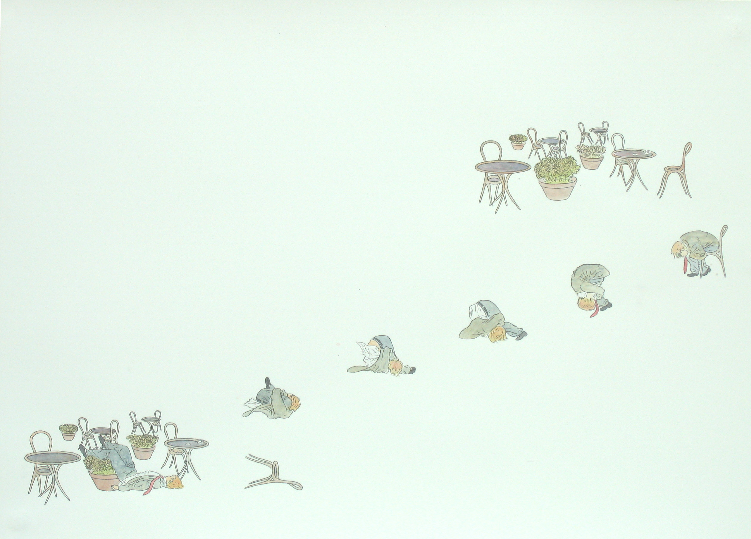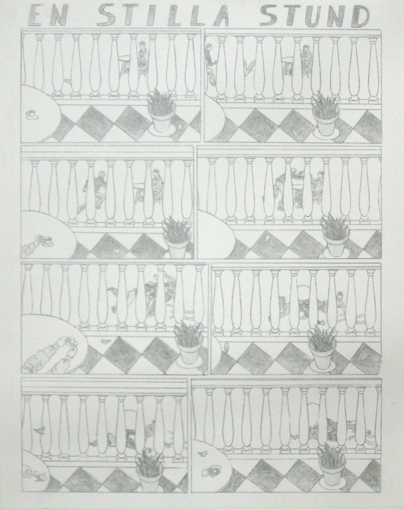 Efter att ha arbetat med de koncentrerade utsnitten med en tanke på något slags tyngre innehåll tryter lusten och tron på att det betyder något, jag känner mig fången av den realistiska avbildningen. Jag vill vara friare, få tillgång till fantasin och berättelsen. Jag börjar teckna figurer, miljöer och små skeenden på ett ganska omständligt sätt.