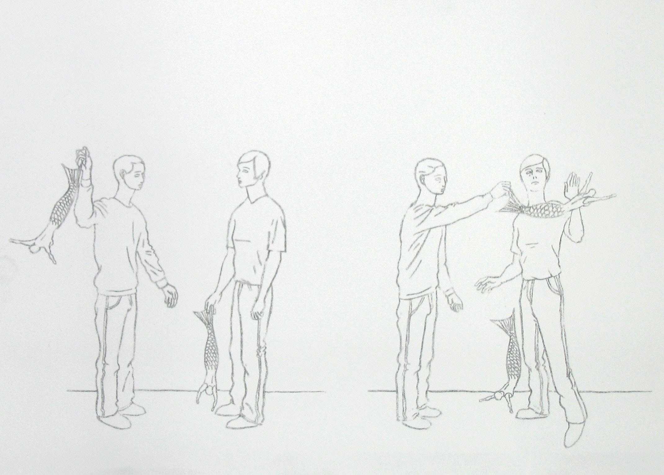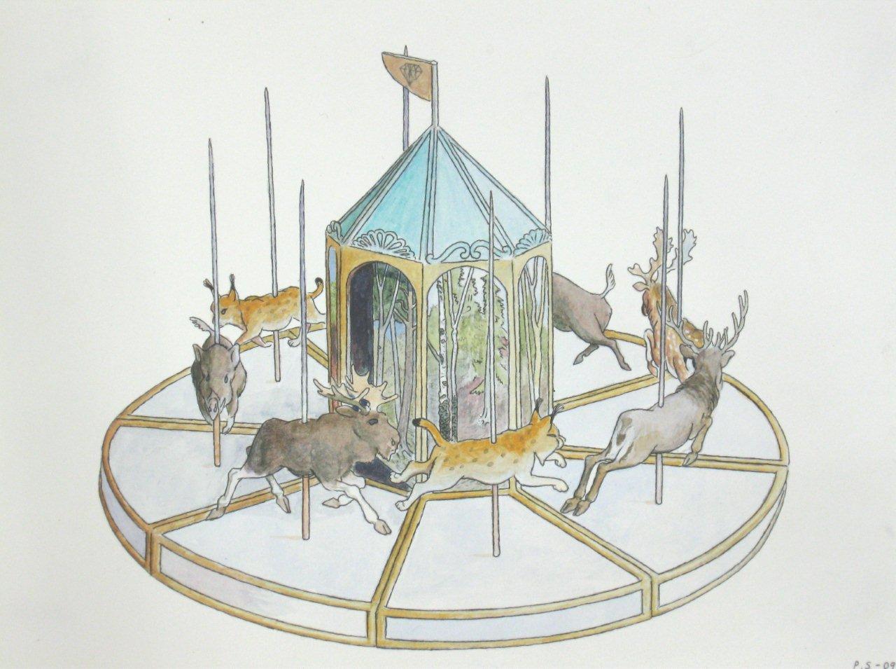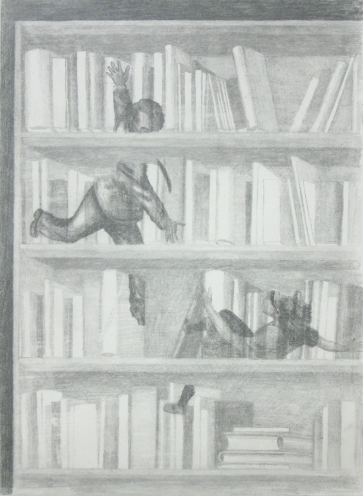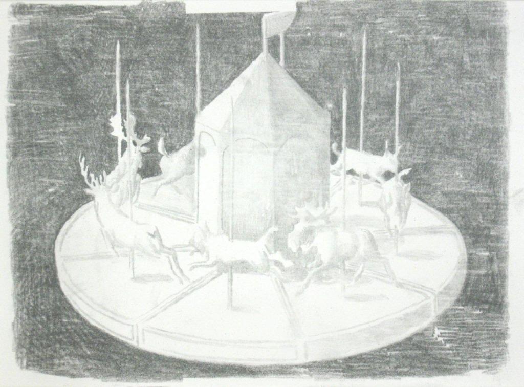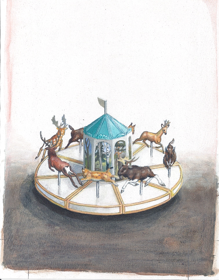 Efter att ha arbetat med de koncentrerade utsnitten med en tanke på något slags tyngre innehåll tryter lusten och tron på att det betyder något, jag känner mig fången av den realistiska avbildningen. Jag vill vara friare, få tillgång till fantasin och berättelsen. Jag börjar teckna figurer, miljöer och små skeenden på ett ganska omständligt sätt.
