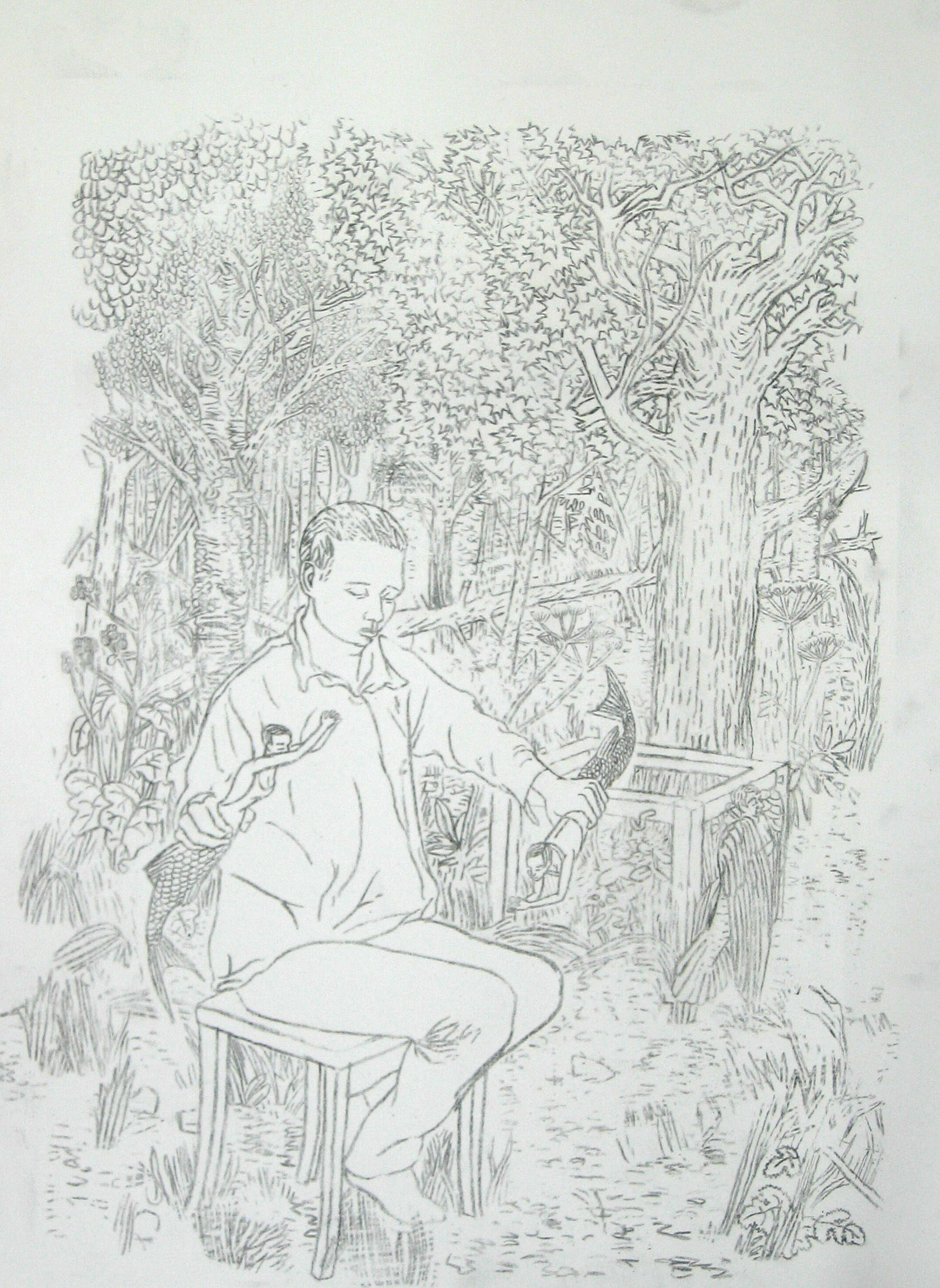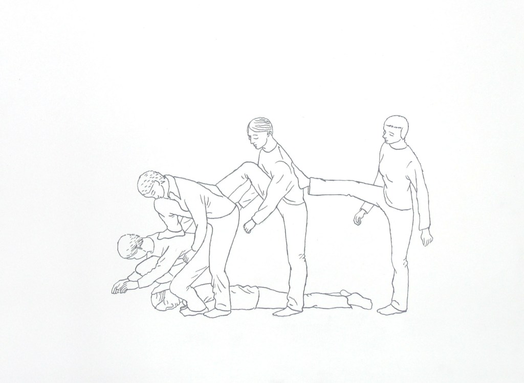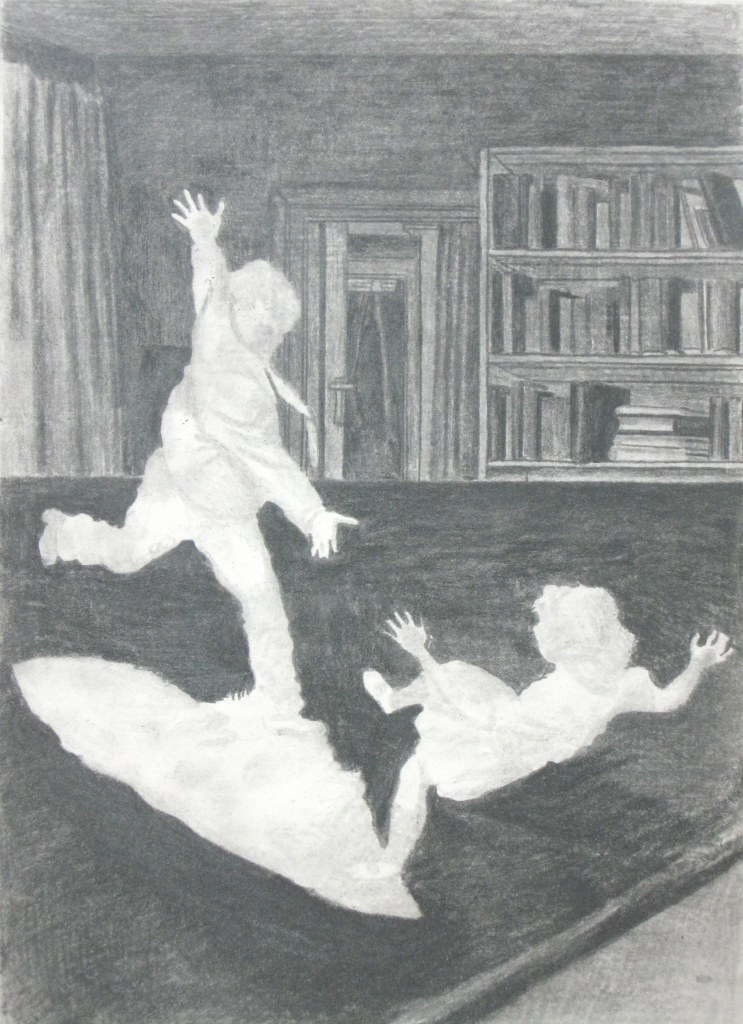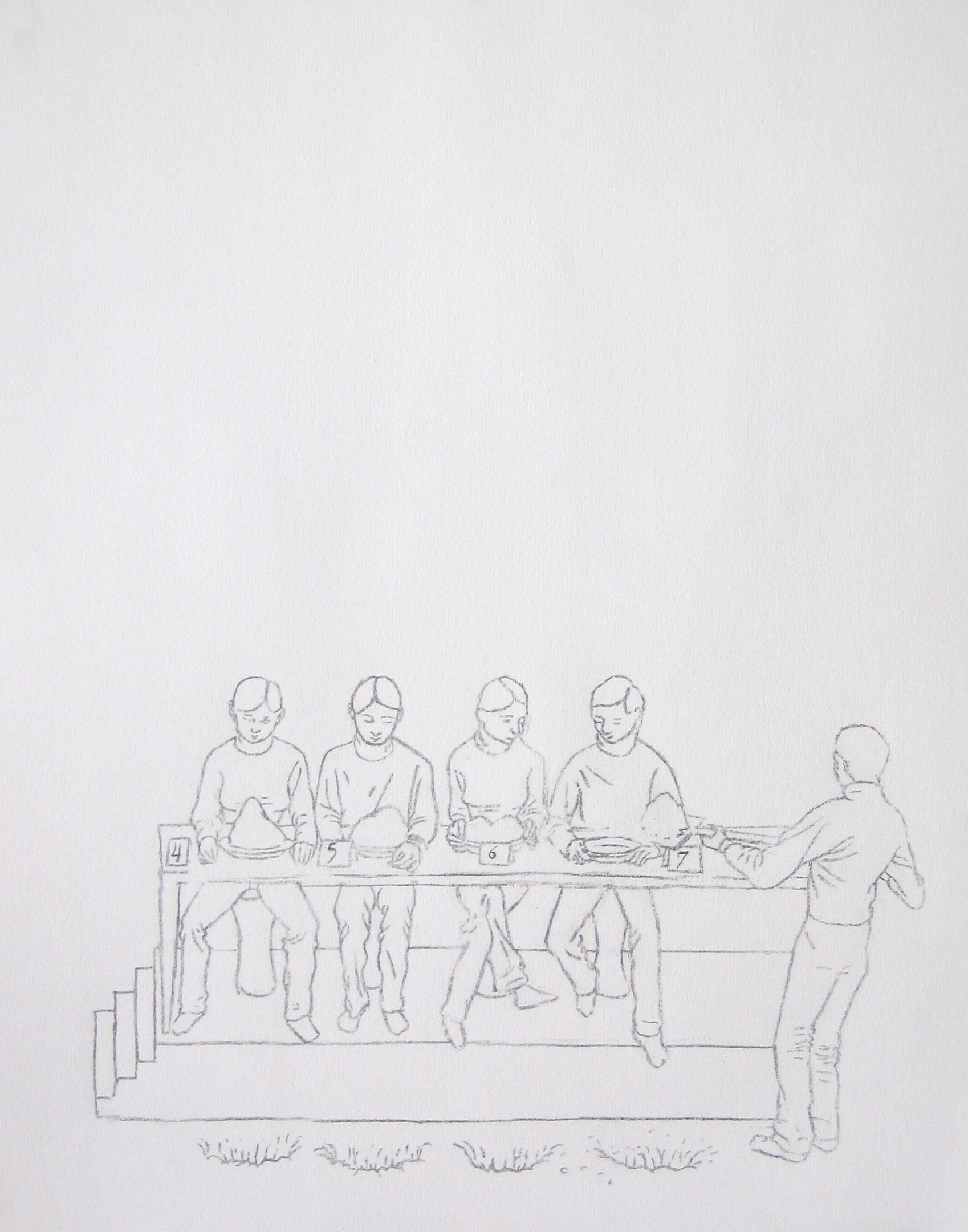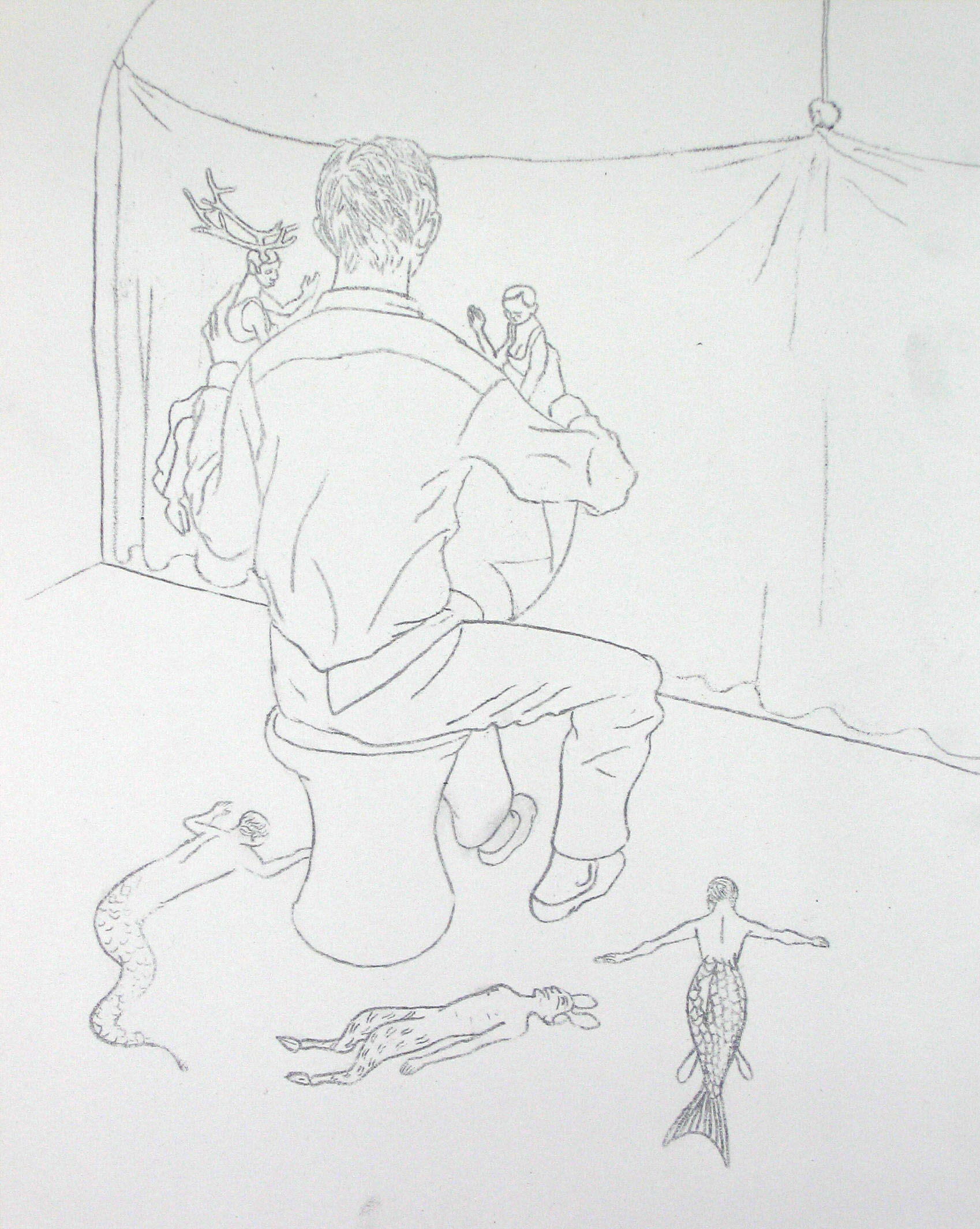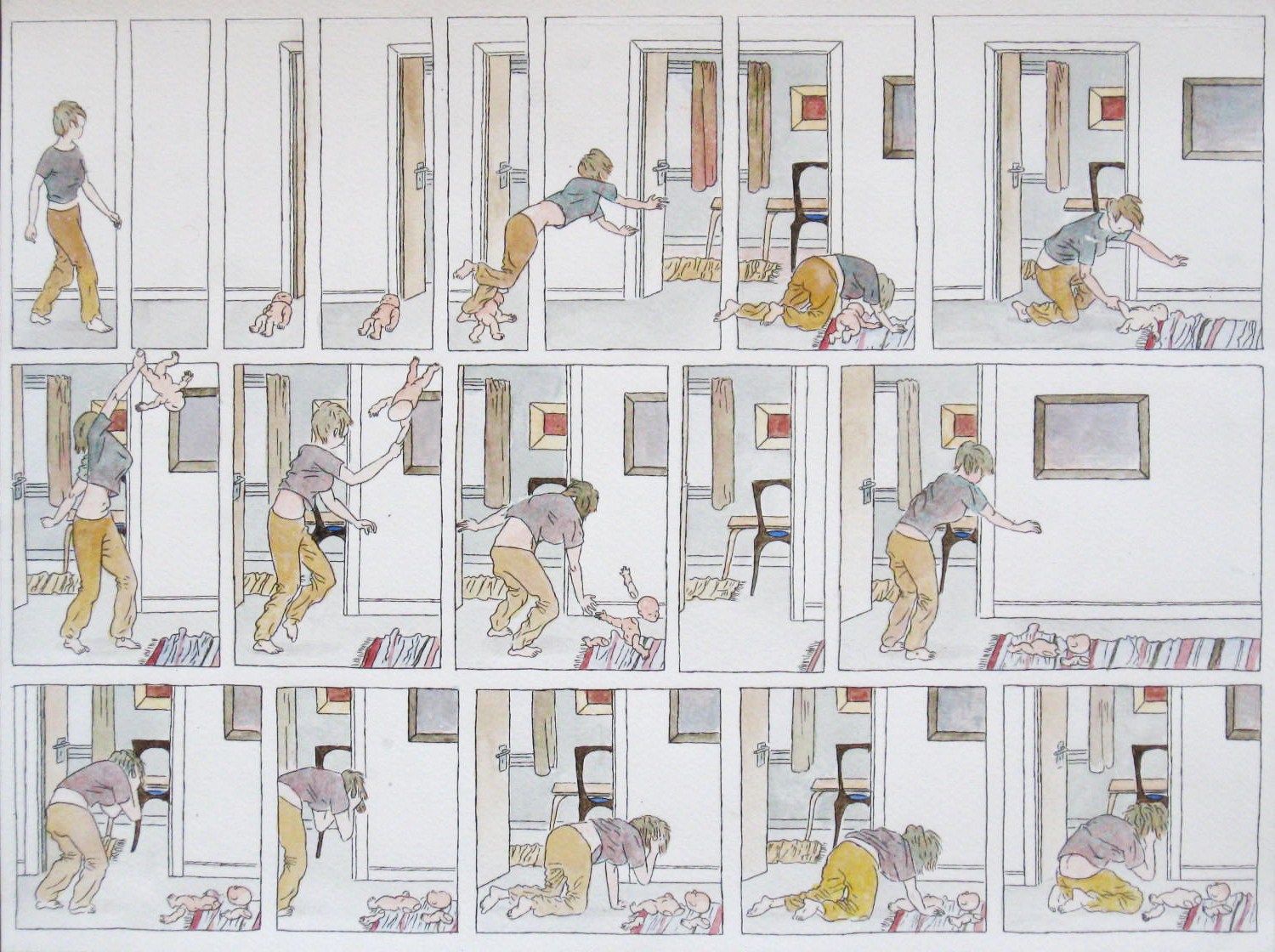 Efter att ha arbetat med de koncentrerade utsnitten med en tanke på något slags tyngre innehåll tryter lusten och tron på att det betyder något, jag känner mig fången av den realistiska avbildningen. Jag vill vara friare, få tillgång till fantasin och berättelsen. Jag börjar teckna figurer, miljöer och små skeenden på ett ganska omständligt sätt.