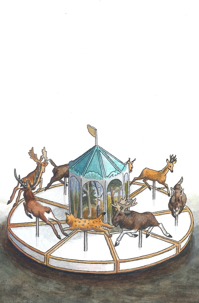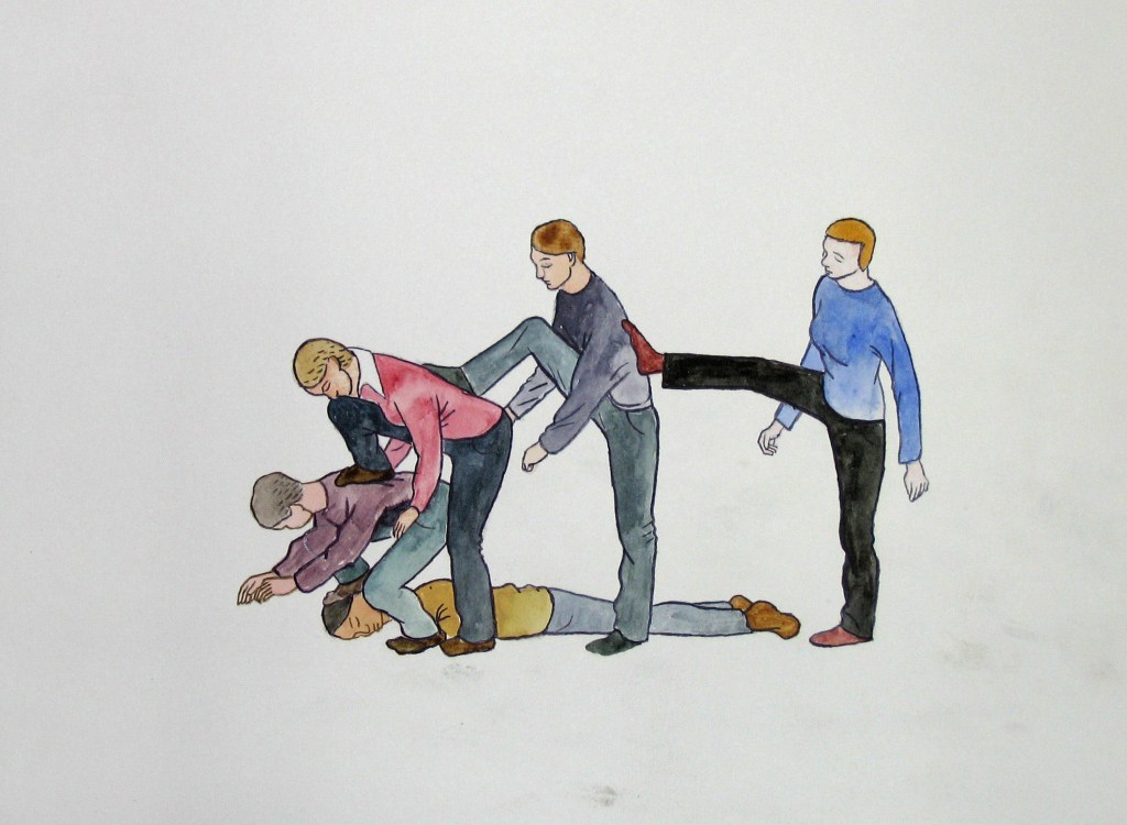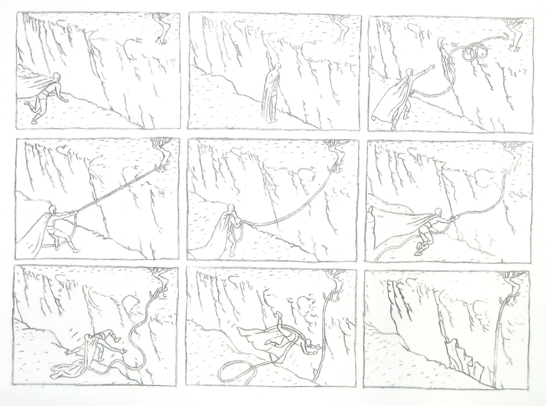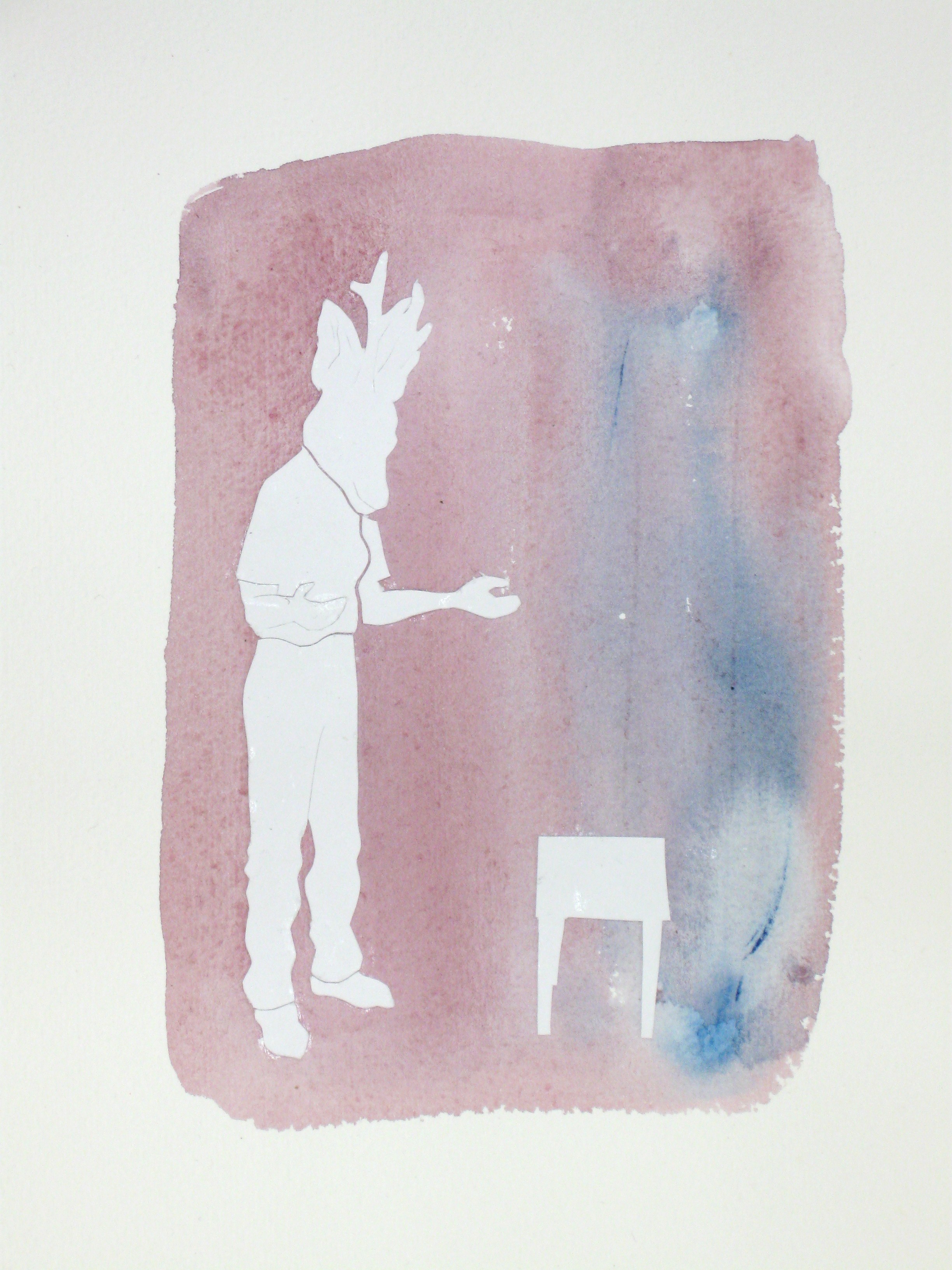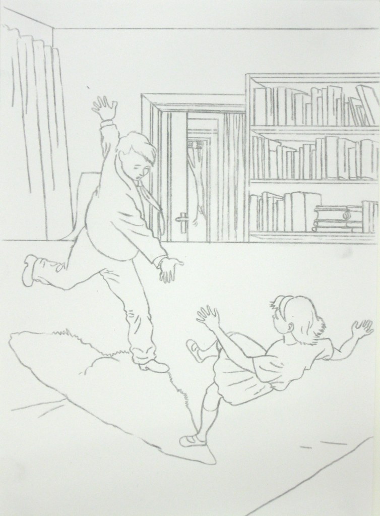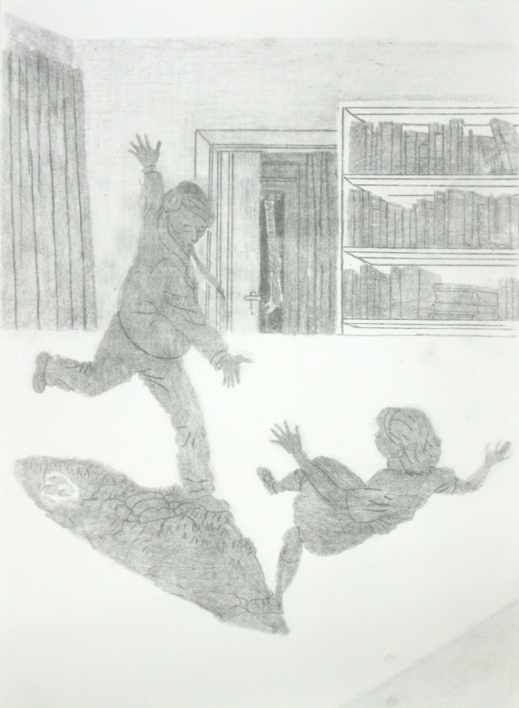Efter att ha arbetat med de koncentrerade utsnitten med en tanke på något slags tyngre innehåll tryter lusten och tron på att det betyder något, jag känner mig fången av den realistiska avbildningen. Jag vill vara friare, få tillgång till fantasin och berättelsen. Jag börjar teckna figurer, miljöer och små skeenden på ett ganska omständligt sätt.