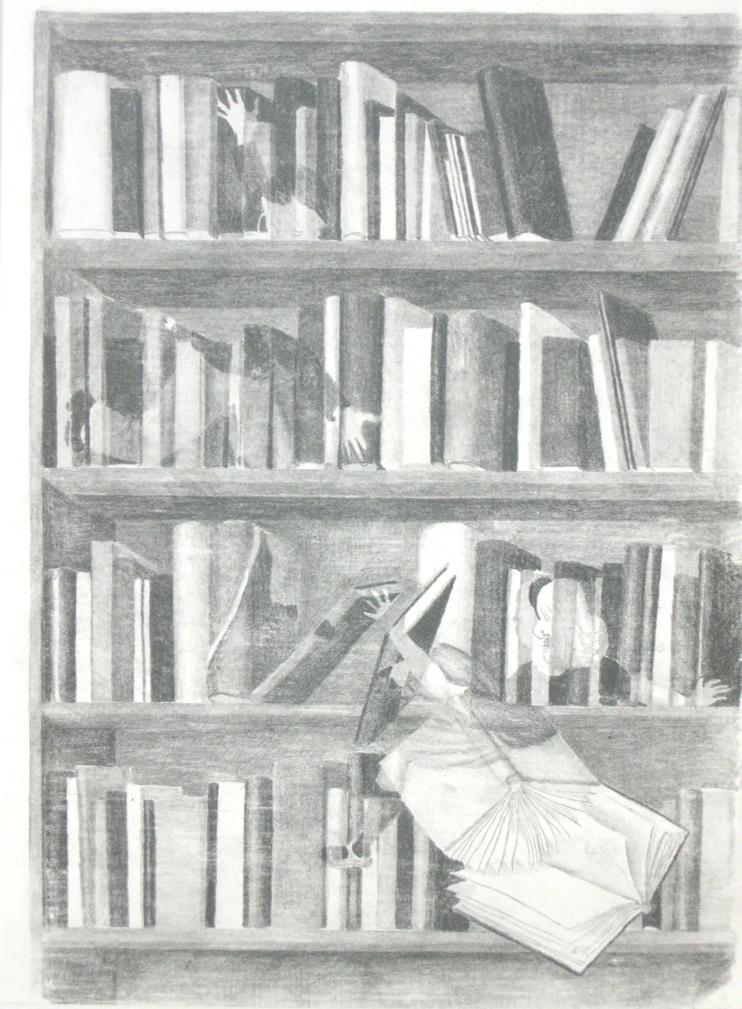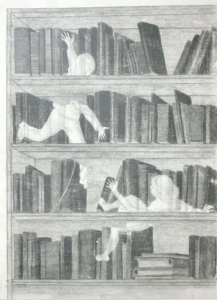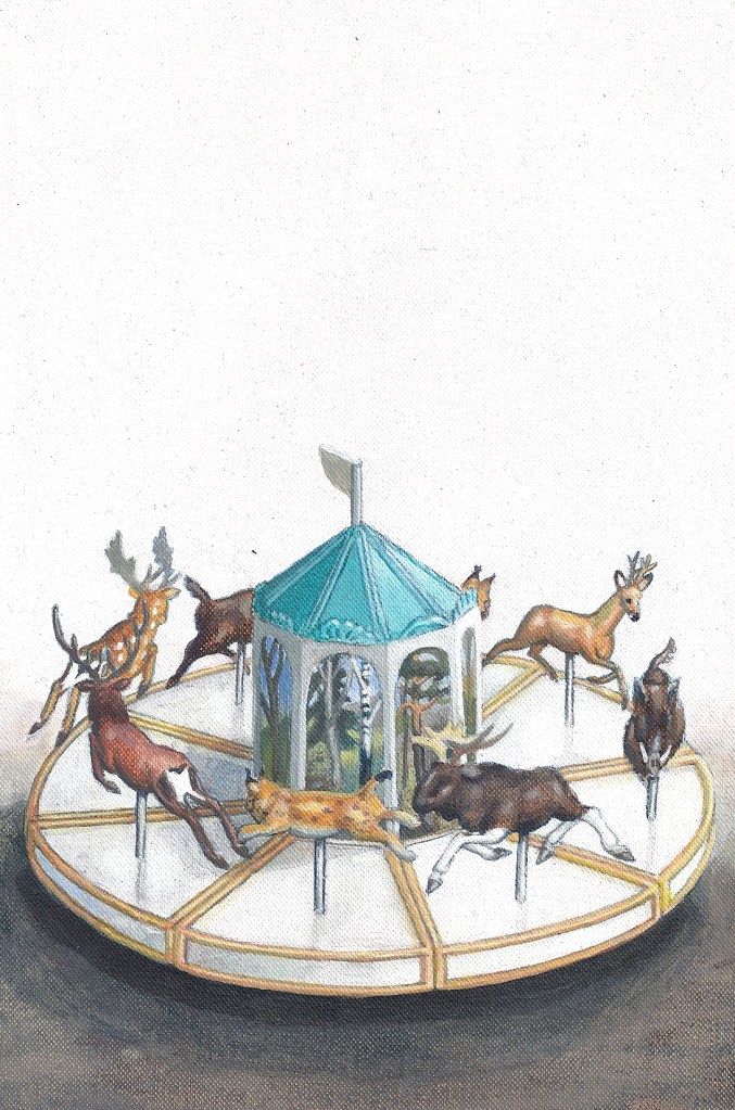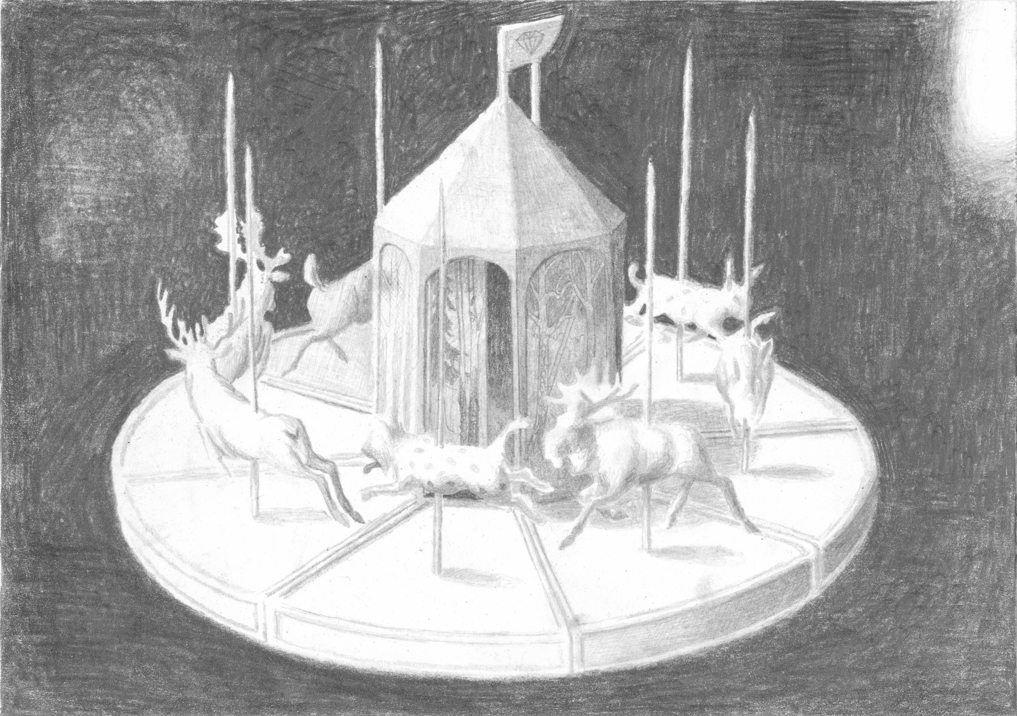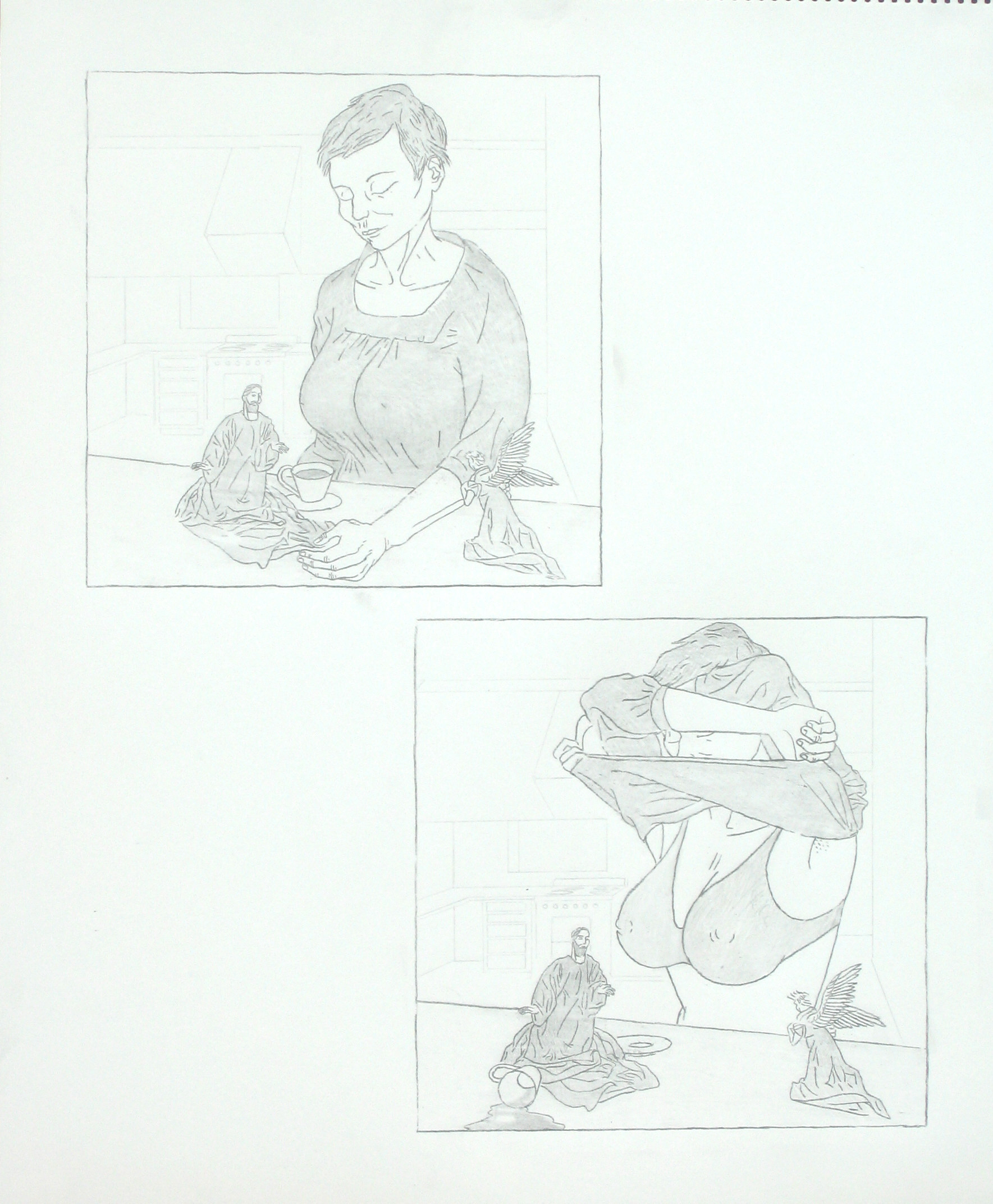 Efter att ha arbetat med de koncentrerade utsnitten med en tanke på något slags tyngre innehåll tryter lusten och tron på att det betyder något, jag känner mig fången av den realistiska avbildningen. Jag vill vara friare, få tillgång till fantasin och berättelsen. Jag börjar teckna figurer, miljöer och små skeenden på ett ganska omständligt sätt.