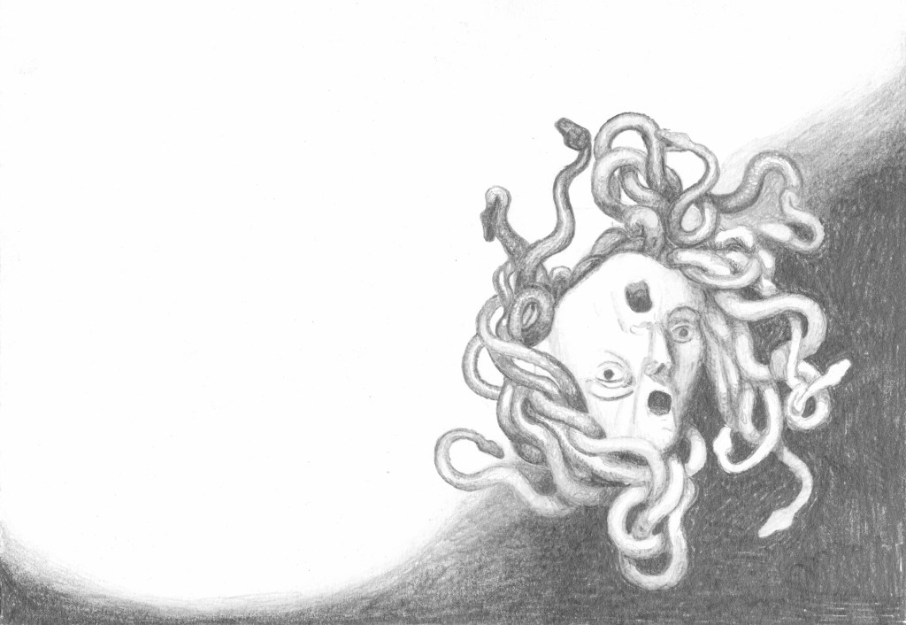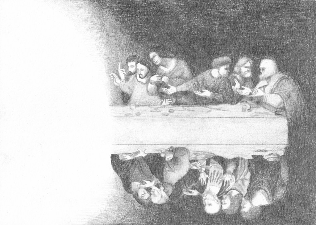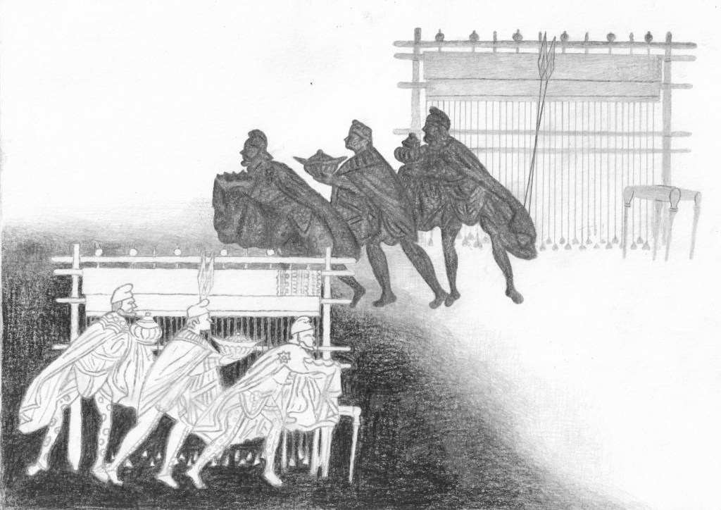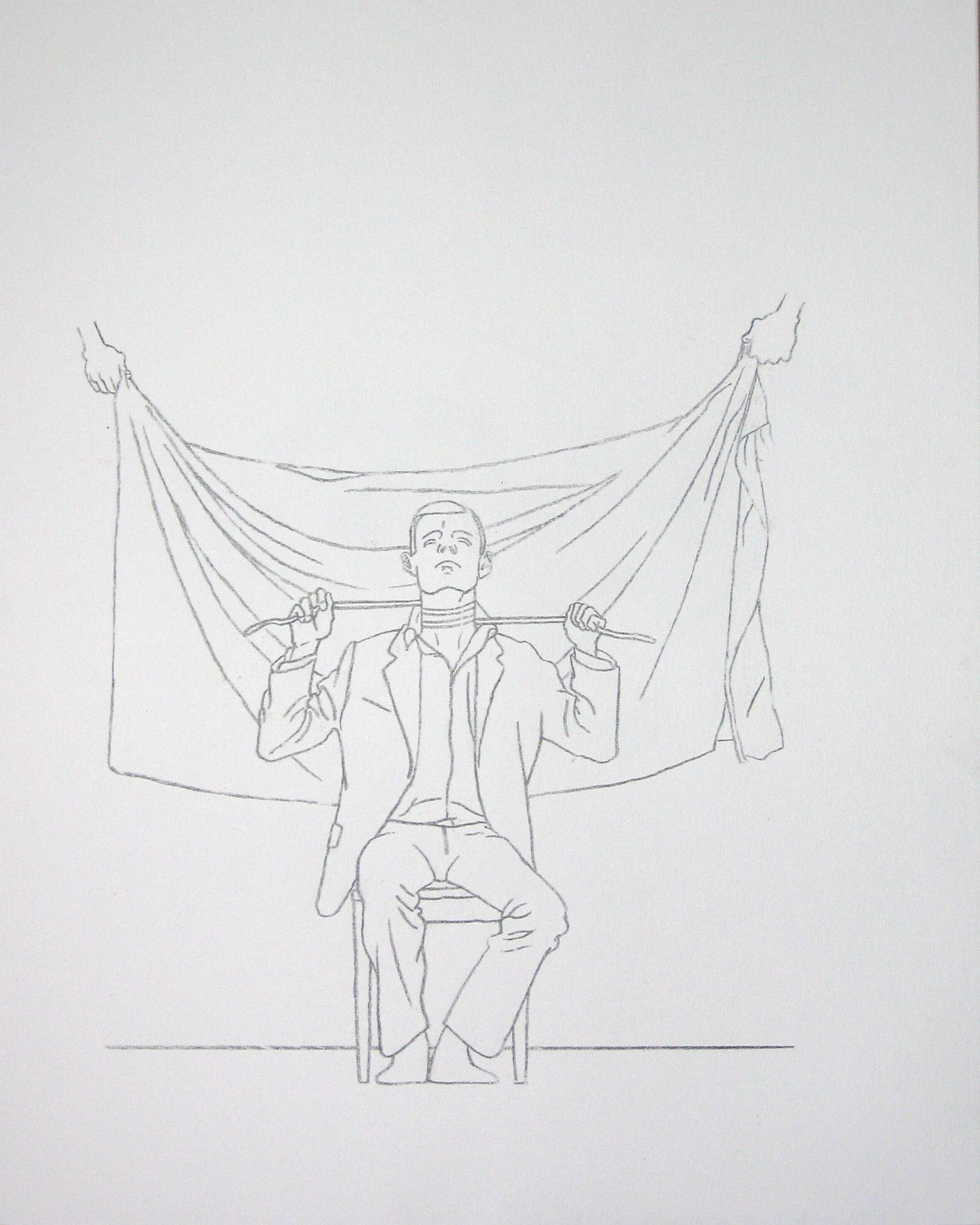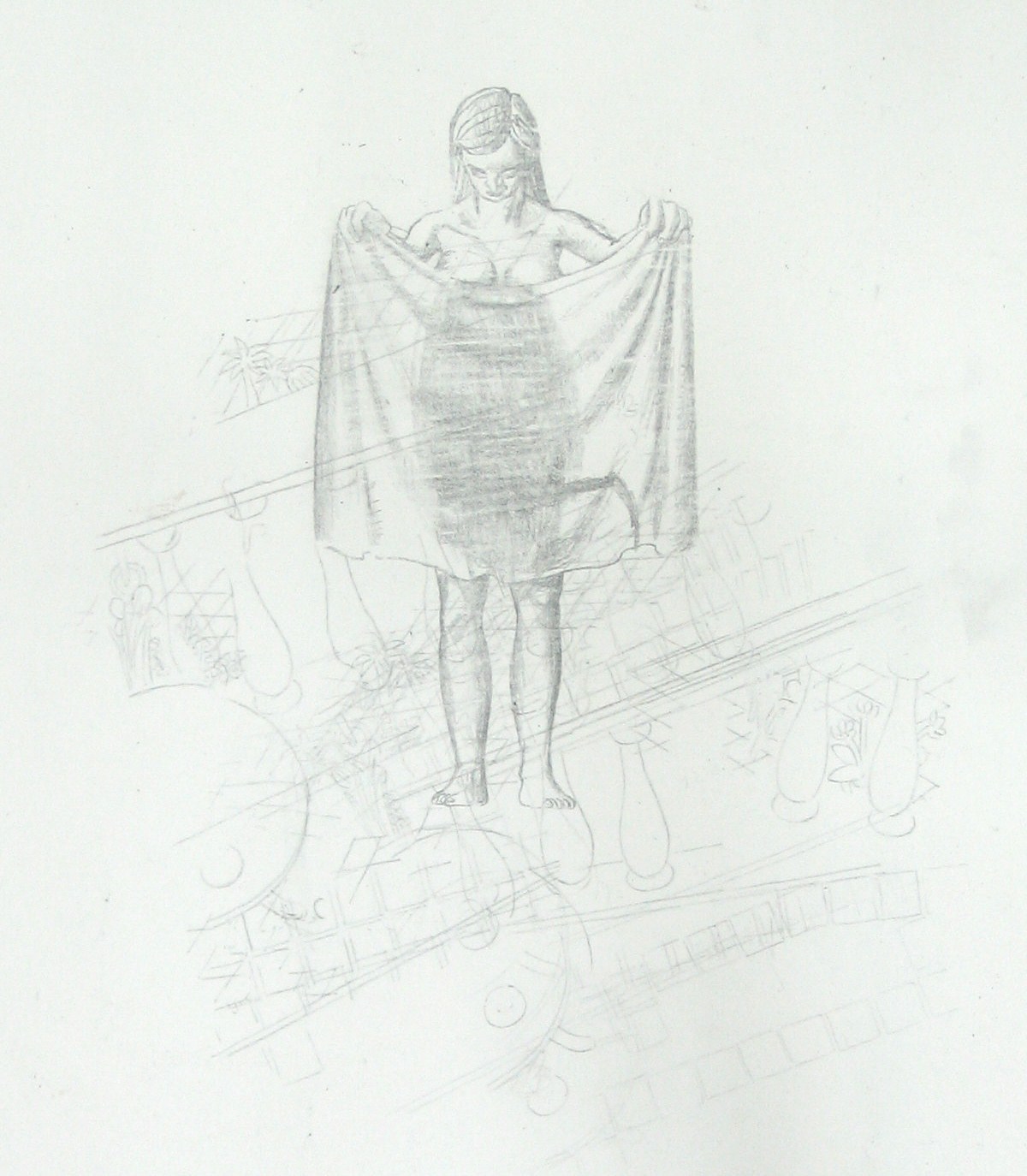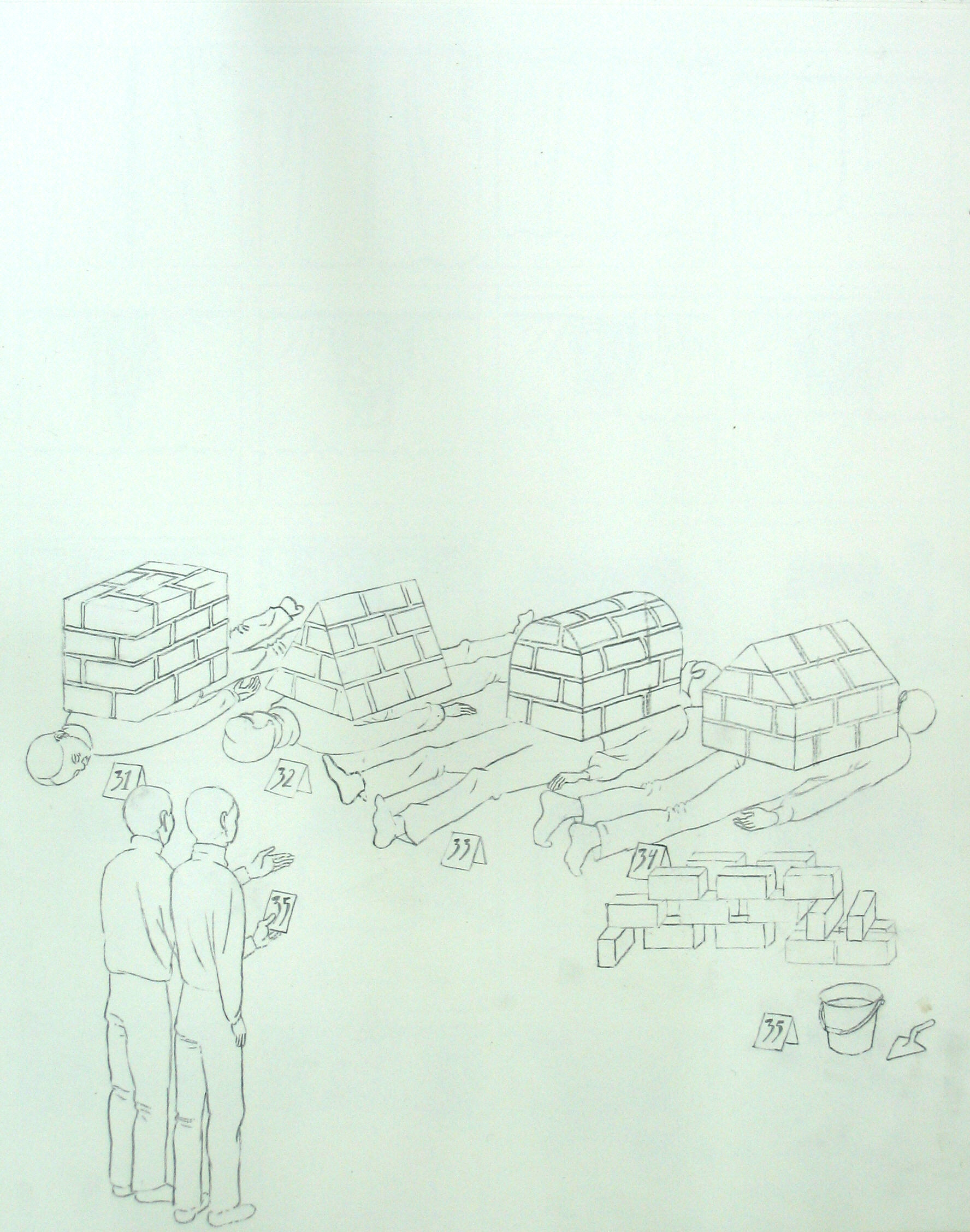 Efter att ha arbetat med de koncentrerade utsnitten med en tanke på något slags tyngre innehåll tryter lusten och tron på att det betyder något, jag känner mig fången av den realistiska avbildningen. Jag vill vara friare, få tillgång till fantasin och berättelsen. Jag börjar teckna figurer, miljöer och små skeenden på ett ganska omständligt sätt.